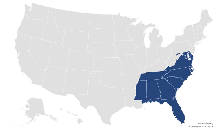 AL, DE, FL, GA, MD, MS, NC, SC, TN, VA + PR, DR